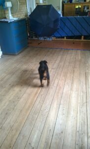 I punkt 7; En paraply smækket op i korrekt afstand til hvalpen. Har denne 1 hvalp nysgerrighed og mod nok til at gå hen og undersøge dette selv og hvor påvirket af situationen er den… Hvor meget hjælp skal den have til at løse opgaven. Hvalp 1 her skal have en del hjælp, som jo ikke behøver at være en dårlig ting, hvis man ikke ønsker en alt for selvstændig hund.