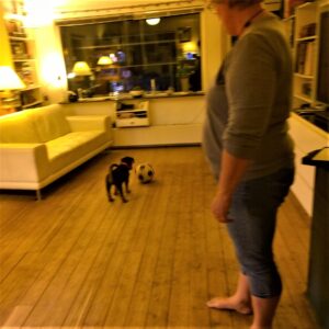 I punkt 8; Lægges der en bold som agere hvidt spøgelse med sorte øjne. Hvalp 1 her er igen den forsigtige hvalp, som ikke er speciel bange, men altså heller ikke nysgerrig nok og på forkant til at løse opgaven selv. Vil den selv gå frem? Nej tak, den skal have en del hjælp, men vælger dog at gå med fremad og undersøge og løse opgaven, som et samarbejde. I grunden meget fornuftigt når man er 7 ½ uge. Efter kontakt med bolden er hvalpen helt afklaret med udfordringen og tør lege med den.